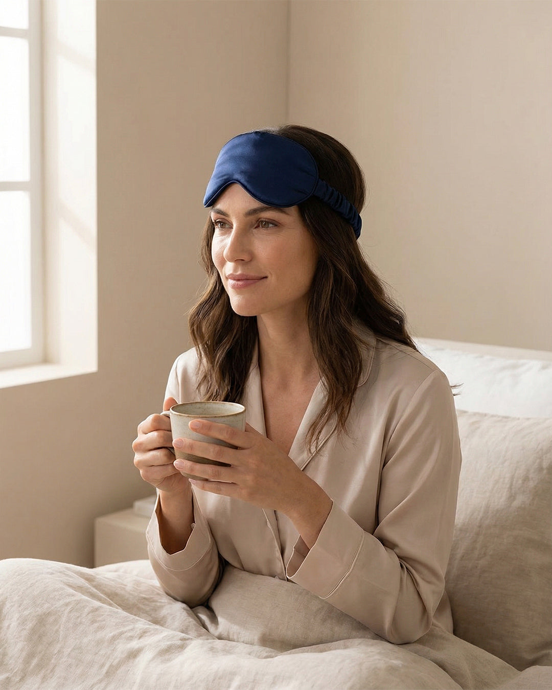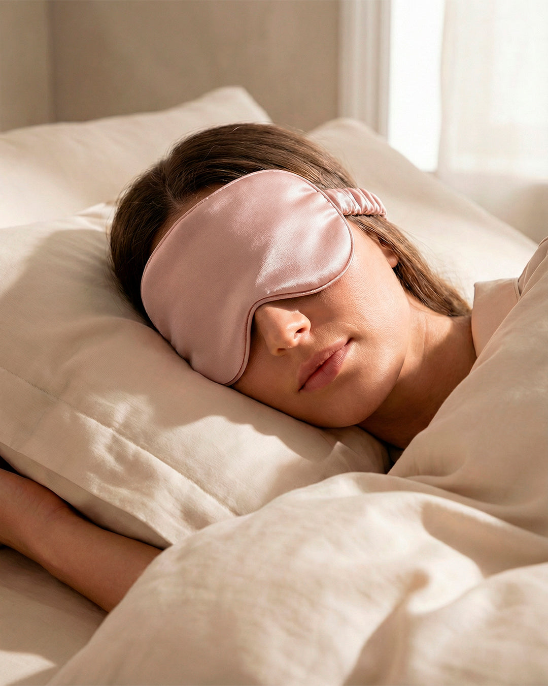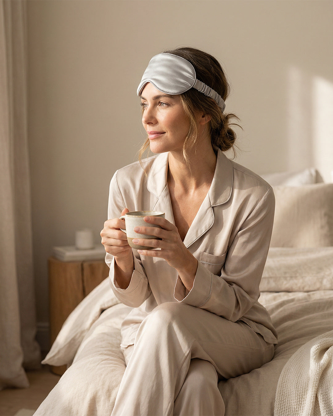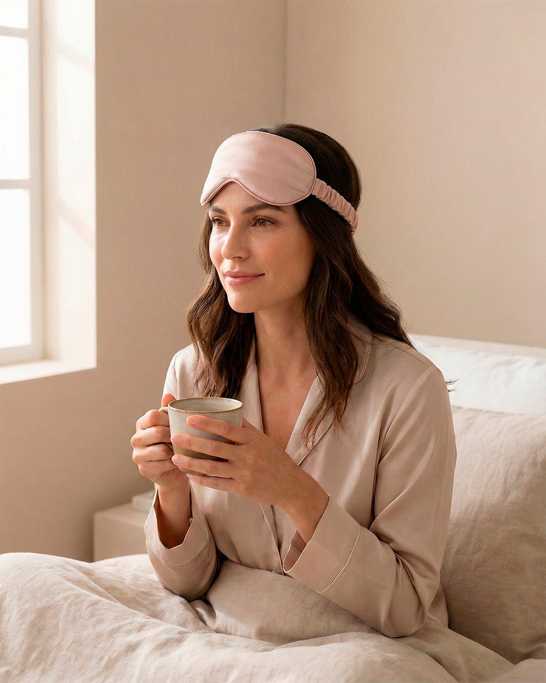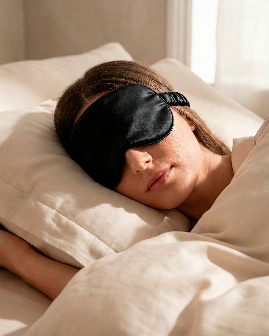 El antifaz de satén Bambüa fue incorporado como complemento del ritual nocturno. Una pieza ligera, delicada y funcional que ayuda a crear un entorno más íntimo para el descanso.